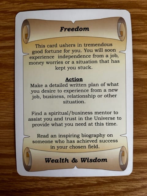 After I pulled this card and wrote about it I looked at my Substack stats. I rarely do this because writing here is not about the numbers to me, I do this for the connection to you and other writers. But also, I am human, so I occasionally look! Today, after pulling the freedom card, I see I have reached the short term goal I set for myself. Holy smokes, I am thrilled. THANK YOU for helping me do that, it means the world to me.